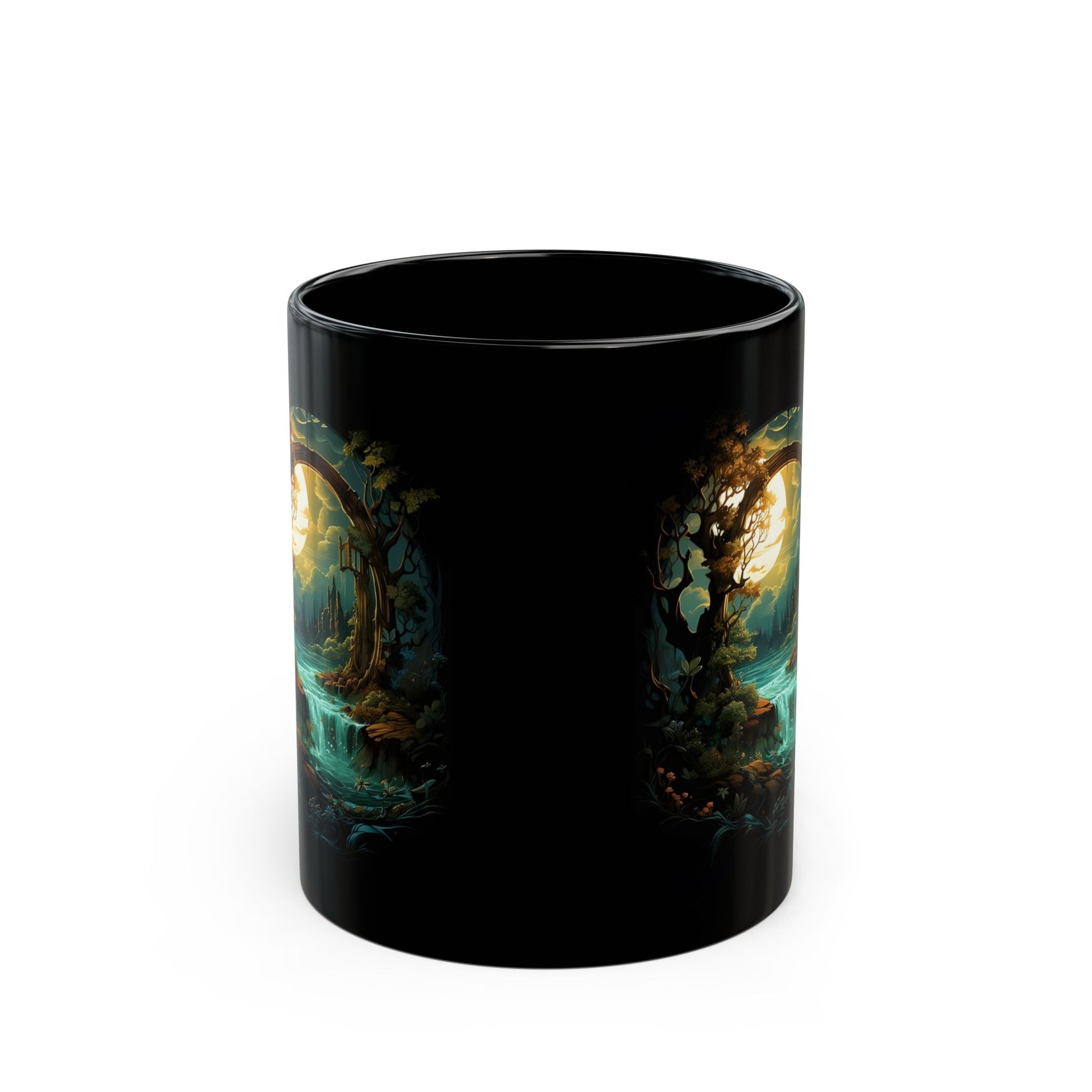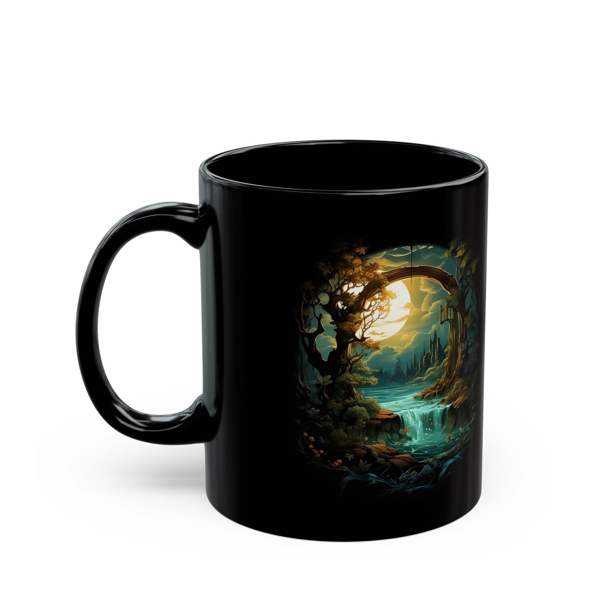 Warm and mysterious, this glossy black ceramic mug carries a pocket of otherworldly landscape—a moonlit archway, misted waterfalls, and ancient trees glowing in teal and gold. It feels like a quiet morning at the edge of a secret forest: slow breaths, steaming coffee, and the kind of calm that turns ordinary routines into small rituals. For those who chase imagined worlds between sips, the dark finish makes the artwork pop while keeping a low, moody profile on the kitchen shelf. Use it during contemplative moments, late-night sketching sessions, or whenever you want a little wanderlust with your caffeine.